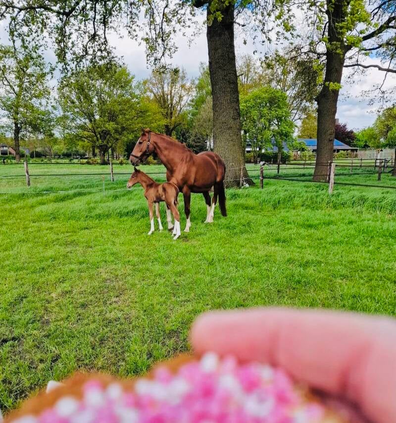 Beschuit met muisjes! En weer roze! Op Koningsdag is er een prachtig en lief merrieveulen geboren uit Harle Quin. Ze heeft de fantastische kleur en aftekeningen van haar moeder. Het was een pittige bevalling. Vandaag mochten ze al even samen buitenspelen. Wat zijn we er blij mee.